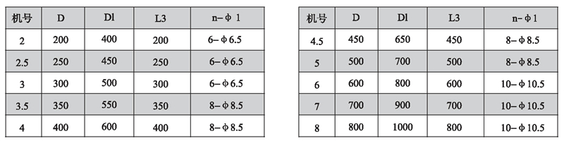 注:風(fēng)機出廠時法蘭一般不打孔。n-φ1僅供參考,若要打孔請用戶在訂貨時說明.
