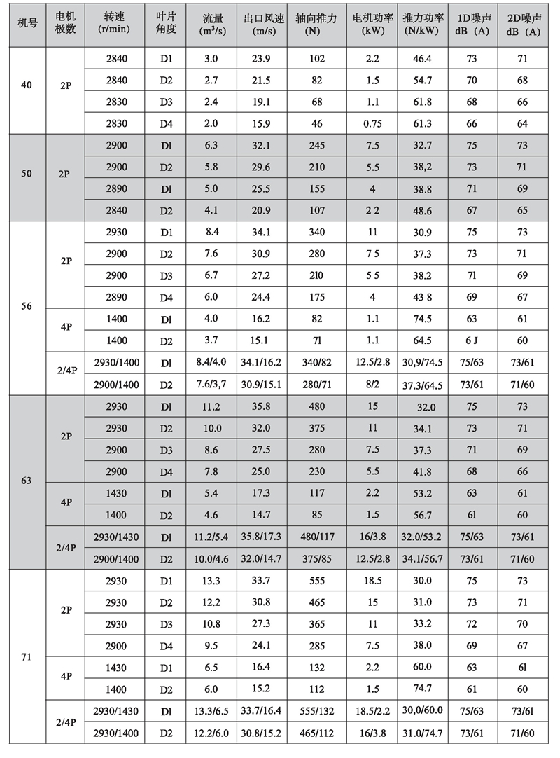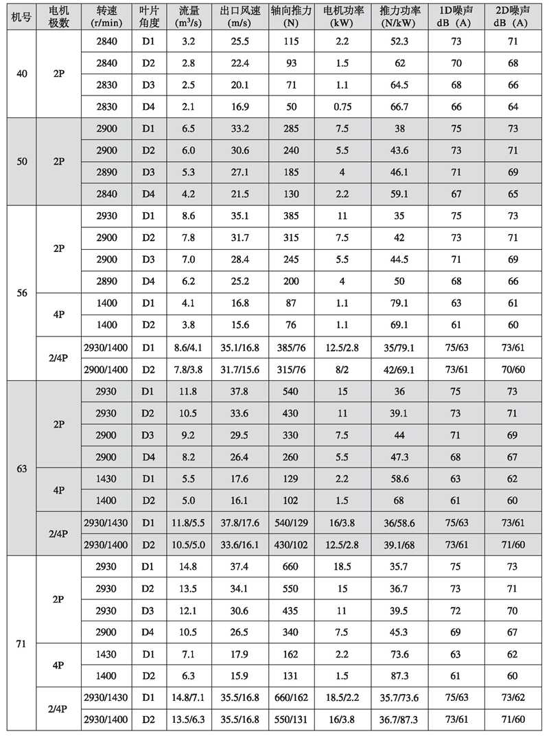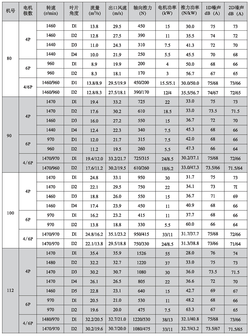 5)性能參數表中所列噪聲值為在野外、距風機出口10米、45度角處測量的A聲級