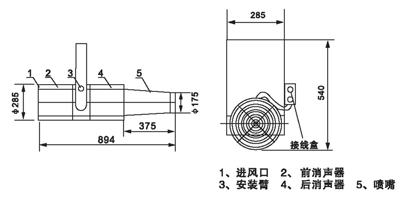 無箱軸流誘導(dǎo)風(fēng)機(jī)由軸流風(fēng)機(jī)、消聲器、噴嘴、固定架組成,回轉(zhuǎn)角度<60”,噴口φ175。