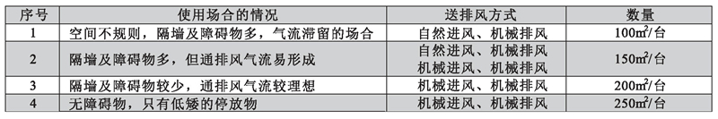 所需誘導(dǎo)風(fēng)機(jī)的臺數(shù),在考慮通風(fēng)方式(機(jī)械送排風(fēng),自然進(jìn)風(fēng)機(jī)械排風(fēng)),有無隔墻,空間形狀的前提下,技每臺誘導(dǎo)風(fēng)機(jī)所要承擔(dān)的面積計(jì)算,可參照下表確定: