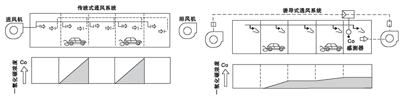 下圖為傳統(tǒng)式風(fēng)管系統(tǒng)與誘導(dǎo)通鳳系統(tǒng)在CO濃度上的比較;